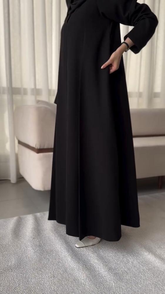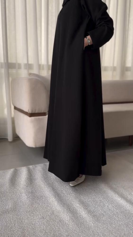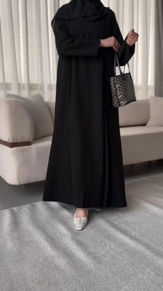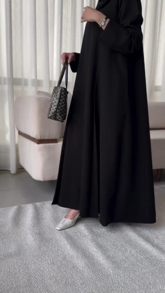 عباية أنيقة من قماش كريب فاخر، بقصّة نص كلوش تمنحك انسيابية وأناقة في كل حركة.