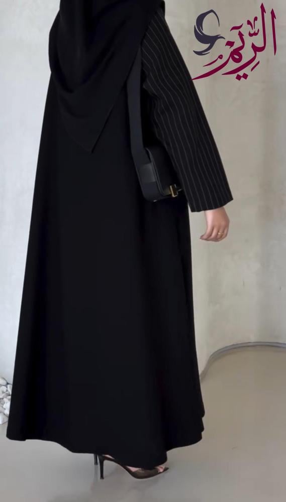 عباية خلودقماش كريب فيراري قصه نص كلوشتحتوي على تدخيلة قماش مخطط في الاكمامالقفله طقطق كاملاللوقو باللون الأسود