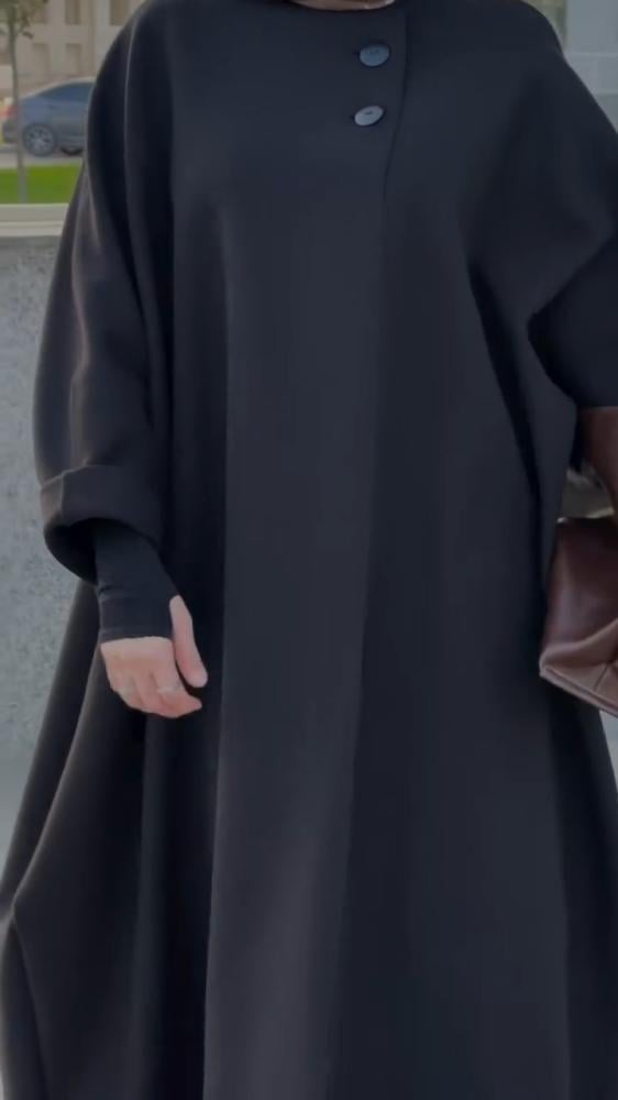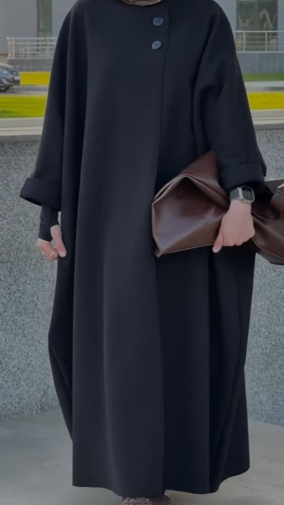 قماش كريب فيراري اسود فاحمعباية فضفاضة واسعة مغلقة بزرين وطقطققصة بشتالقفلة ازرار وطقطق مغلقة بالكامل