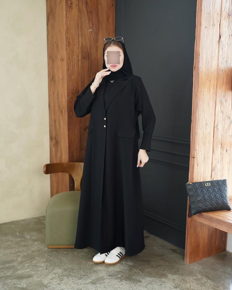 عباية أنيقة من قماش كريب فيراري فاخر، بقصّة نص كلوش تمنحك انسيابية وأناقة في كل حركة.