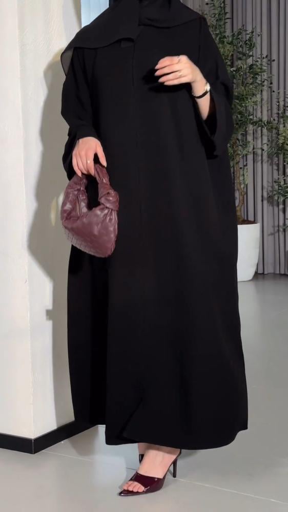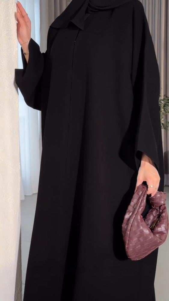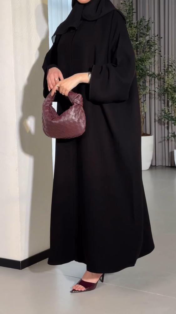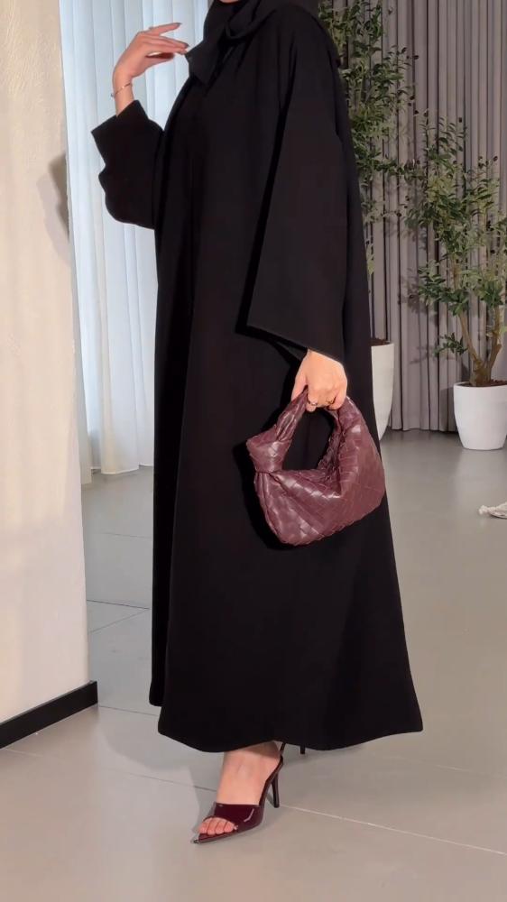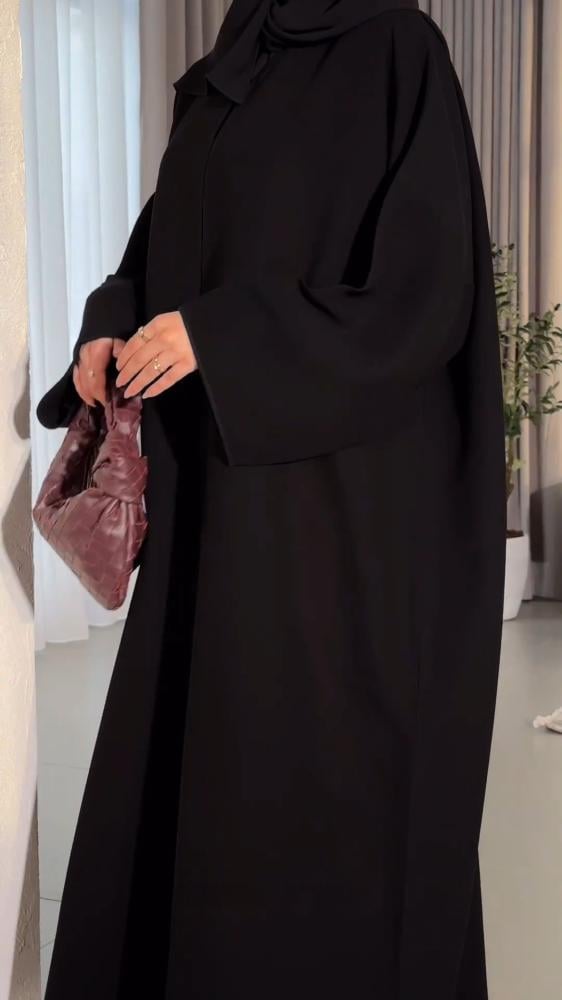 عباية أنيقة من قماش كريب فاخر، بقصّة نص كلوش تمنحك انسيابية وأناقة في كل حركة.